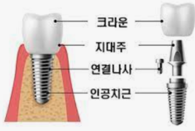 요즘에는 이가 약하신 젊은 분들도 임플란트 시술을 많이 하고 있습니다. 임플란트의 경우 크게 세 부분으로 나뉘는데요. 치아 뿌리를 대신하는 구조물인 임플란트 (인공치근), 그 위에 체결을 하는 보철기둥 (지대주), 마지막으로 그 위에 씌우는 보철물 (크라운) 이 있습니다.